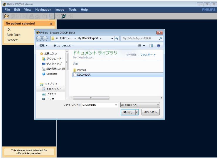 上記ビューワーを立ち上げて、左上の「File」を開きます。 すると下記のような画像が表示されます。DICOMDIR(画像格納インデックス)を選択すると、画像が表示されます。