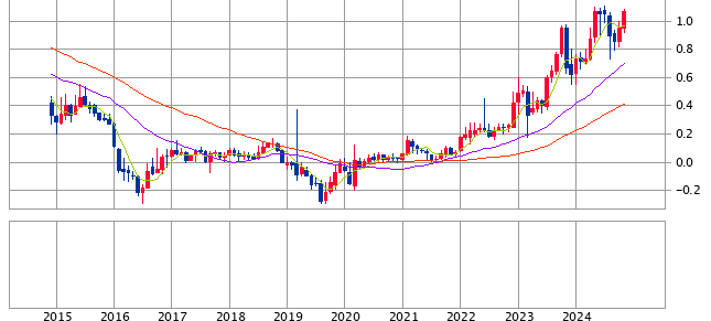2024/11/18現在の利回りは1.08%。永久デフレが囁かれていた暗黒の2010年代からは、想像もできない高金利です。もちろん、諸外国と比較すると、まだまだ低金利です。