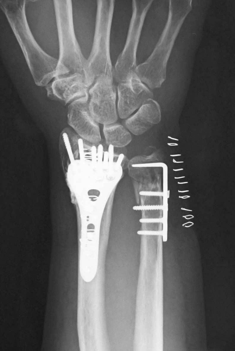 かなり粉砕した粗鬆骨だったので固定性が心配でしたが、さすがフックプレートだけあって、尺骨遠位端に関しても比較的しっかりした固定を得ることができました。