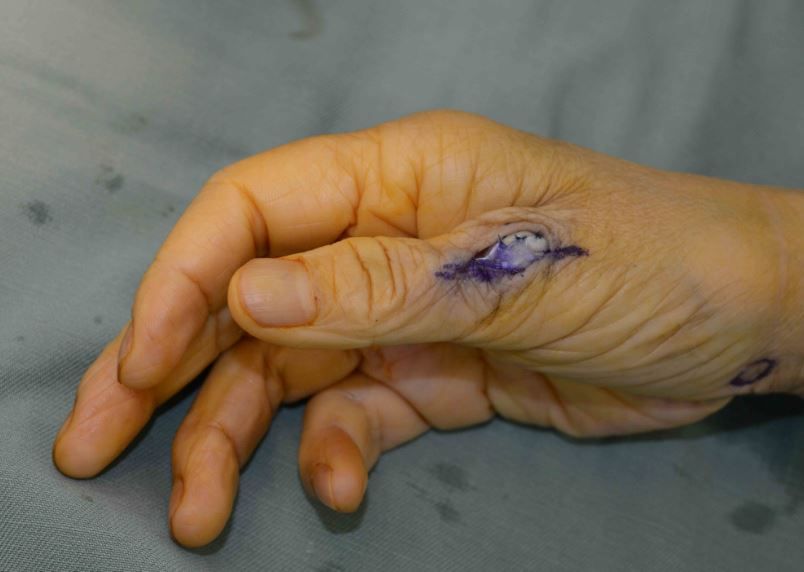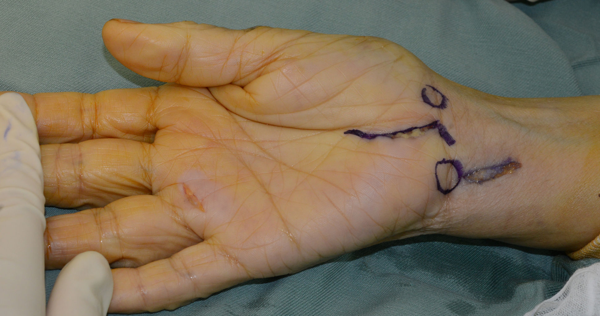 1~2週間様子をみて改善が無ければ、手根管内へのストロイド注射を施行します。この際、皮内針(27G針)を長掌筋腱の尺側から手根管内に注射するとよいでしょう。