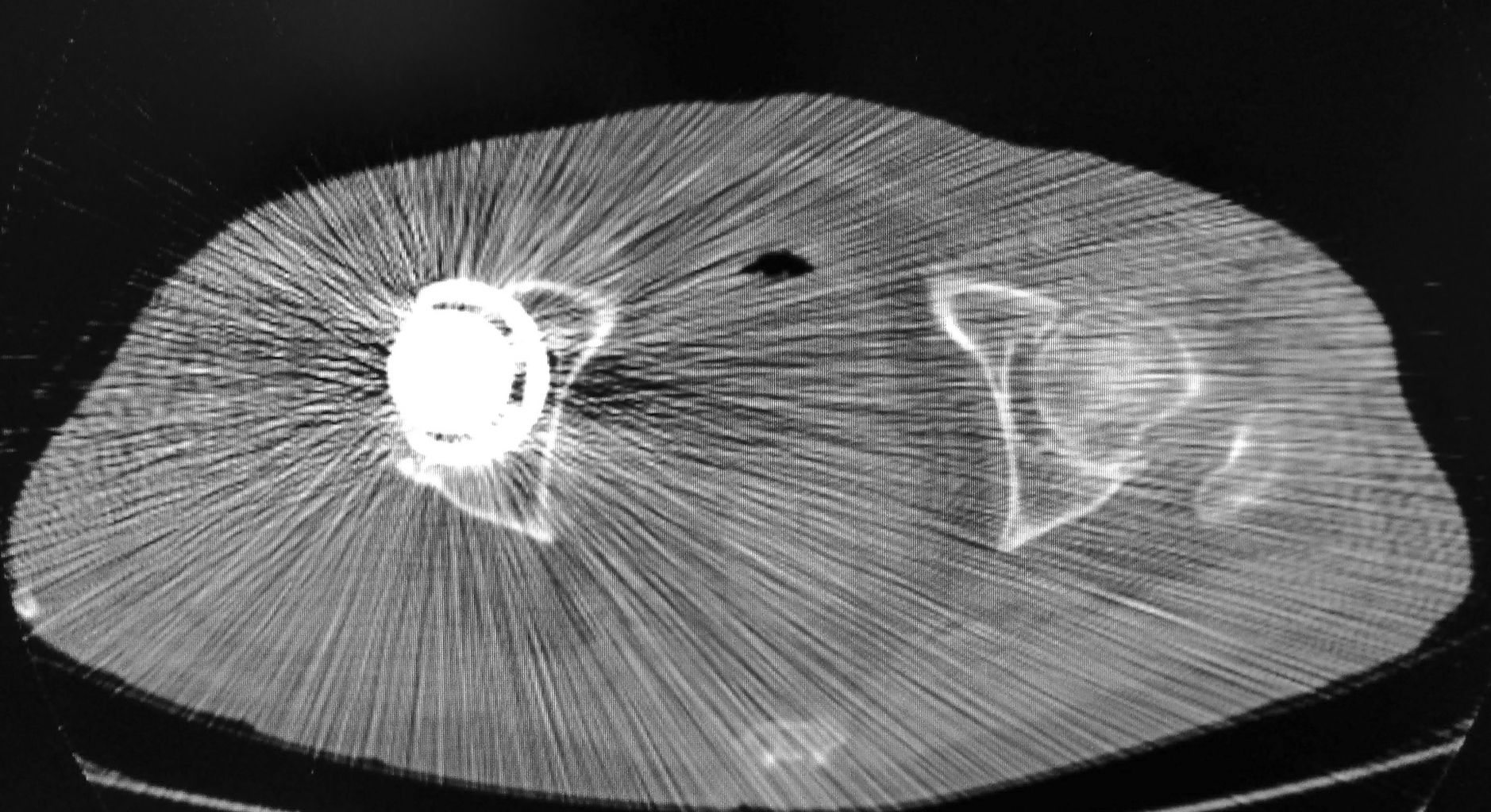 上図は、術後の単純X線像(臥位)です。臥位ではなんの変哲も無い股関節です。カップの外方傾斜角は40度ですが、前方開角はほぼゼロとなっています。